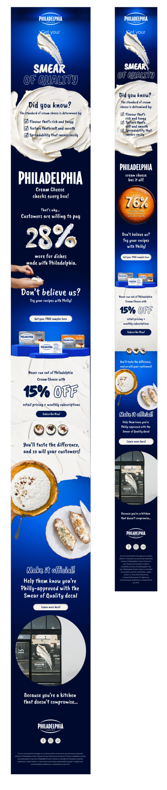 We repositioned Philly cream cheese as a must-have for professional kitchens, using stats to prove it’s the customer favorite. Showcasing its versatility across cuisines, our message was clear: It’s clear from the smear—it’s Philly. The campaign makes the iconic smear the hero of every menu through social media, print, personalized sample packages, and guerrilla marketing.
